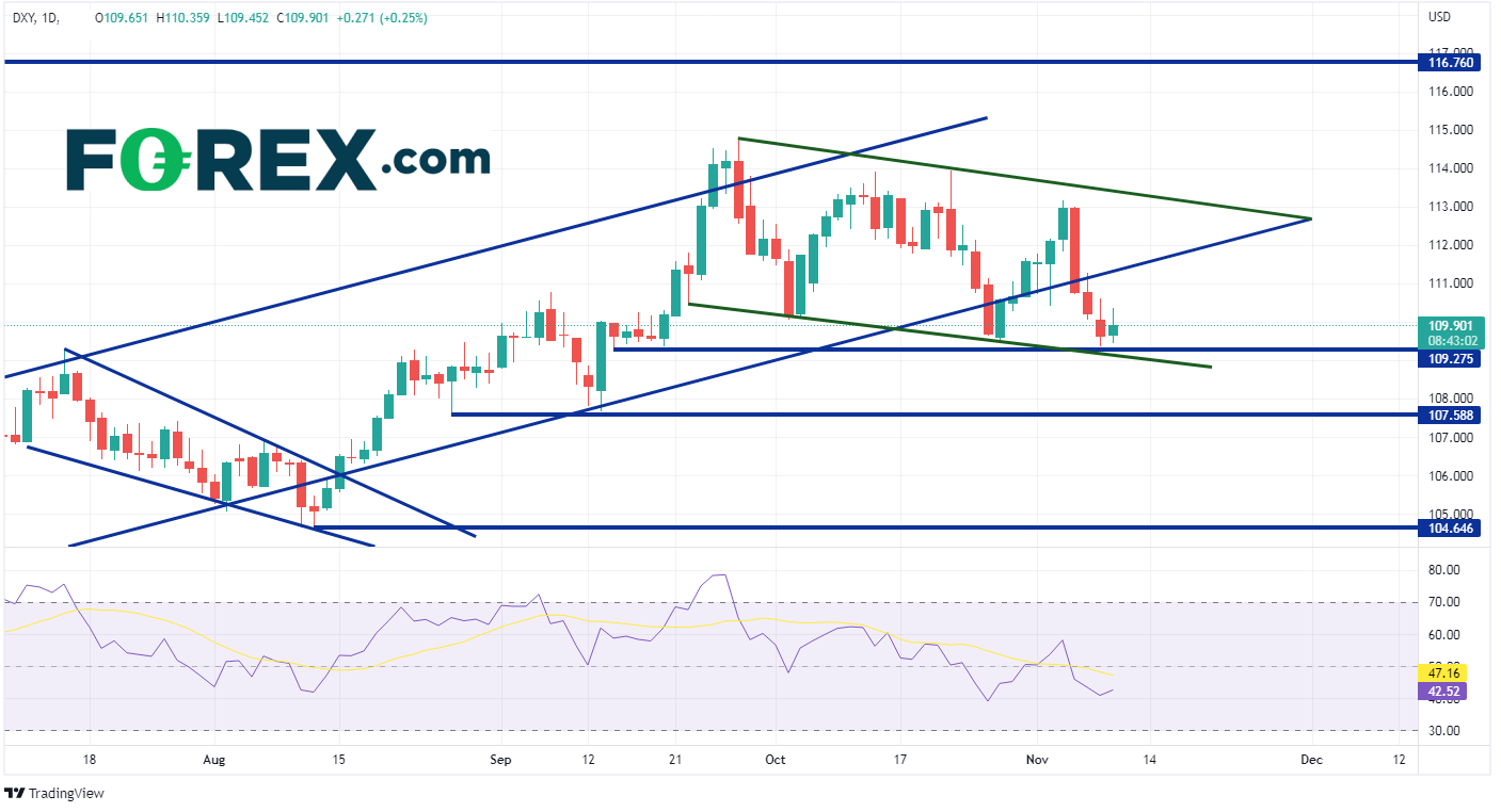 美元自928日创下114.78的高点以来持续走低。周五,DXY创下日内新高112.99。但到周二收盘时,美元指数跌至109.37,考验920日的低点。