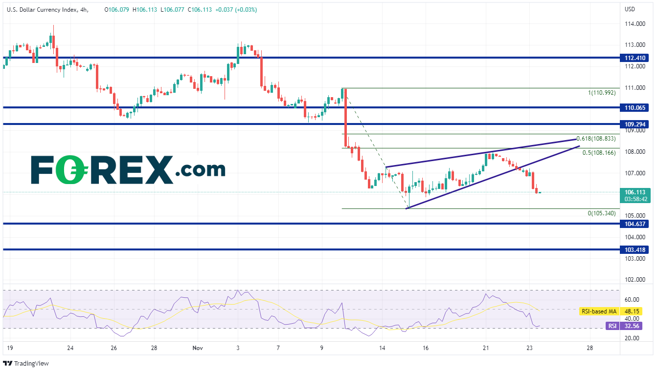 11月2日,美元指数最初的走势显示美联储将持鸽派立场。然而,在鲍威尔指出峰值利率会更高后,它随即走高。美元指数在11月2日收于111.55附近,基本持平,下影线较长。它在周五继续走高,达到高点113.15。然而,在市场有更多时间消化发言后,美元指数下跌220点,至110.72附近。然后,它突破了对称三角形的底部趋势线,此后该指数再也没有回头。美元指数在3月31日低点至9月28日高点区间的50%回撤位106.34附近止住跌势。今天,在FOMC会议纪要发布后,美元指数跌至106.03。