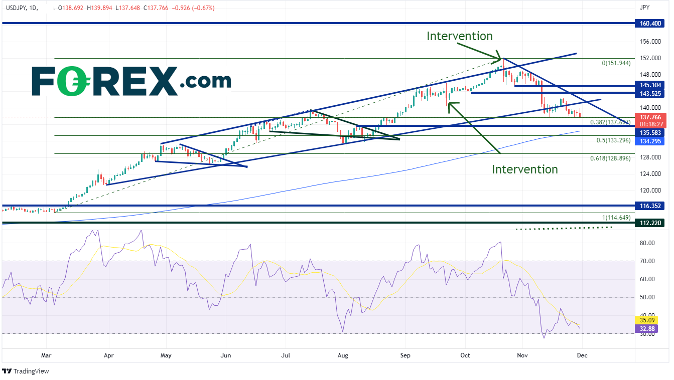 此次鲍威尔鸽派转向的最大受益者是日元。美元/日元自10月21日日本财务省最后一轮干预后,从高点151.95不断走低。11月10日单日内下跌545点。不过跌势在9月13日低点至10月13日高点的38.2%回档位137.70附近暂停。鲍威尔的讲话能否刺激货币对进一步下跌?