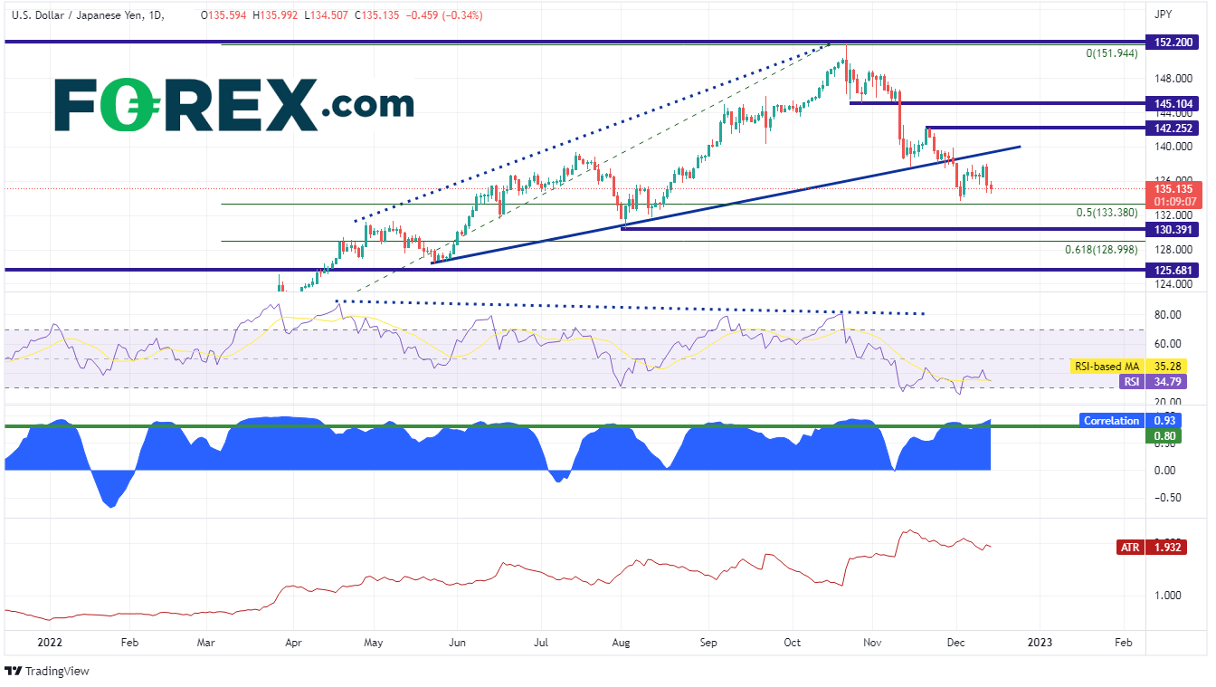 在以美元/日元图表为例,美国两年期国债收益率与美元/日元相关性高达+0.93。相关性系数高于+0.80则视为强正相关性,因此这两大资产走势很可能趋同。美元/日元低点为134.51,高点135.99,波动区间为148点子。美元/日元的真实波幅均值(见表格底部)为193点子。FOMC会议召开原本是市场重要活动,结果并未引发市场剧烈反应,美元/日元交投价甚至未突破真实波幅均值。