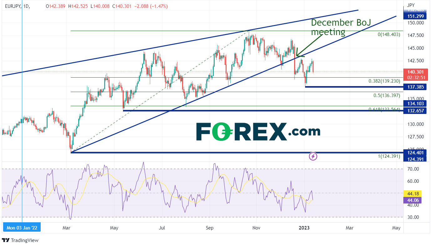 然而,日元不仅是兑美元上涨。欧元/日元也下跌了200多点。在2022年的大部分时间里呈上升楔形走高后,该货币对创下2014年以来的最高点148.40。然而,在上次日本央行会议当天,欧元/日元跌破楔形底部趋势线,回撤至2022年低点至2022年高点区间的38.2%斐波那契回撤位139.23。不过价格随后从该点位反弹,现在又再次接近该点位。下方的支撑位在13日的低点137.38,然后是上述区间的50%回撤位136.40