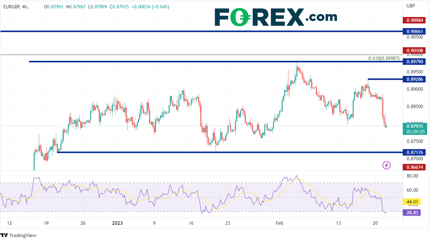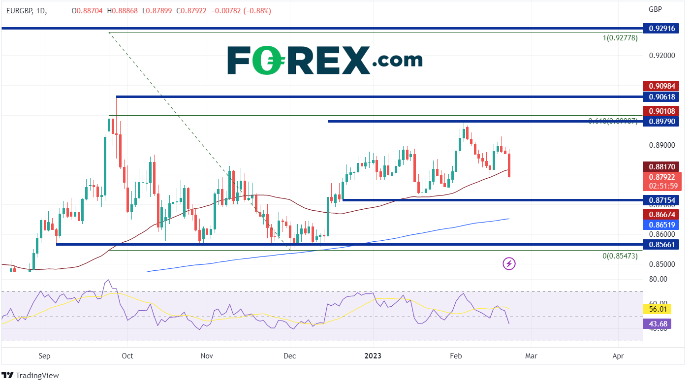 2022926日,欧元/英镑涨至20209月以来的最高水平,接近0.9278,因为前首相利兹·特拉斯的预算计划让市场陷入恐慌。在接下来的几天里,秩序恢复,到2022121日,欧元兑英镑创下了低点0.8547。此后,该货币对反弹至2022926日高点到2022121日低点区间的61.8%斐波那契回撤位0.8999附近。然而,自12月下旬以来,欧元/英镑仅交投于0.87150.8979之间。随着今天英镑的强势崛起,该货币对正在经历自117日以来的最大单日抛售,盘中下跌-0.88%。请注意,今天的价格自20221215日以来首次跌破50日移动平均线。
