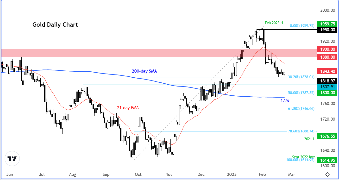 FOMC会议纪要公布之前,黄金略微反弹,但现在谈论筑底还为时过早。这是因为自本月初以来,我们看到债券收益率重新走强,美联储和欧洲央行似乎都比市场预期的更鹰派。自这些央行会议以来,即将公布的数据大多好于预期,尤其是美国通胀和就业数据支持靠更多加息为经济降温的观点。但今天的FOMC会议纪要会与美联储最近的鹰派言论相一致吗?而对黄金交易员来说更重要的是,美元和收益率是否会进一步影响美联储的策略?