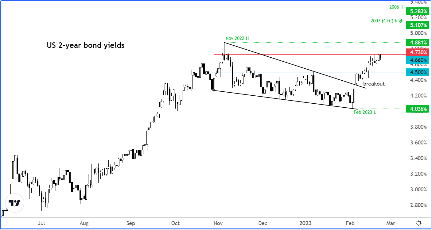在美联储重新采取鹰派论调之后,2年期国债收益率目前正接近11月高点4.881%。如果达到这一点位,这将进一步增加持有非生息商品的机会成本。