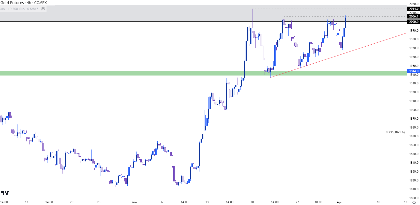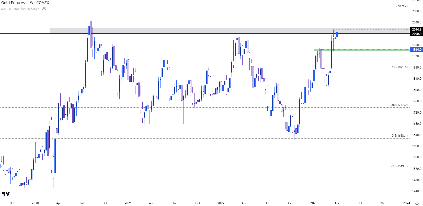 到了这一次,围绕美国银行业的担忧逐渐显露并影响走势——过去两周金价都在测试2,000美元的阻力位。多头在上上周周初再次发力,价格迅速被推高至年内高点2,015美元。