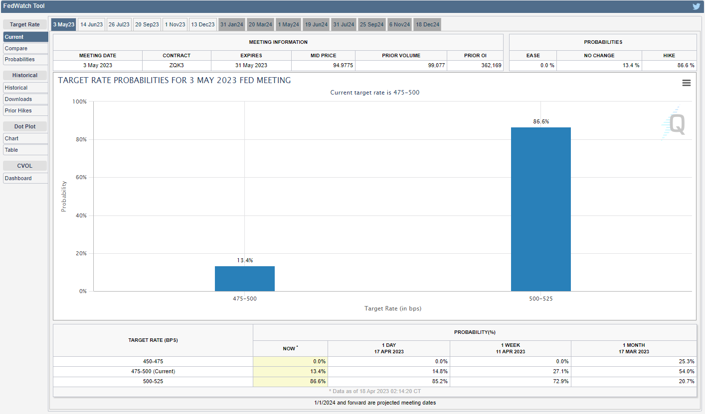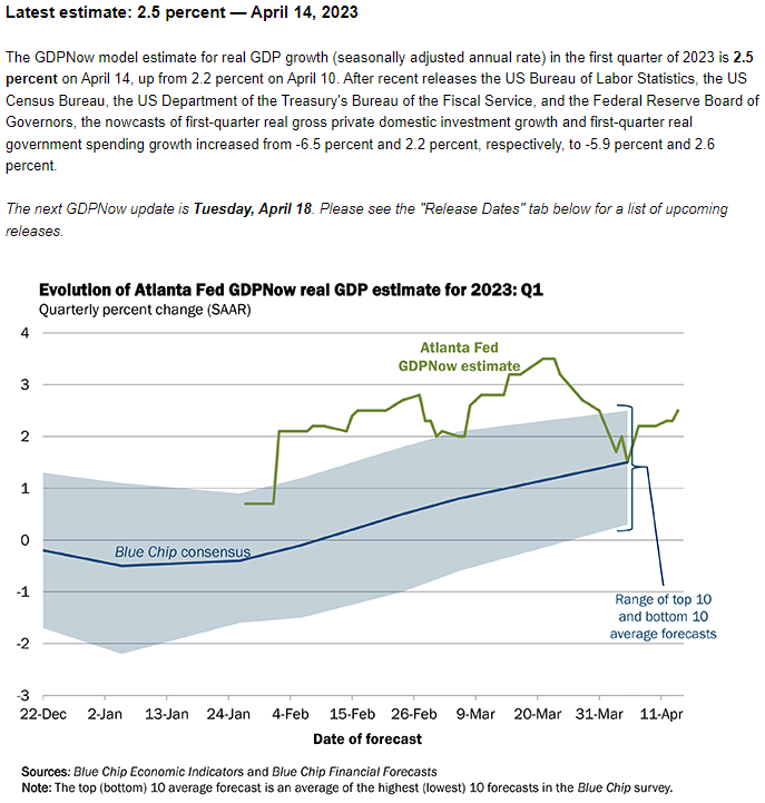 根据亚特兰大联储GDPNow模型,“414日对2023年第一季度实际GDP增长(经季节性调整后的年率)的估计为2.5%,高于410日的2.2%”,几乎没有证据表明经济衰退迫在眉睫可能会促使联邦公开市场委员会(FOMC)实施更高的利率,因为通胀仍远高于央行2%的目标。