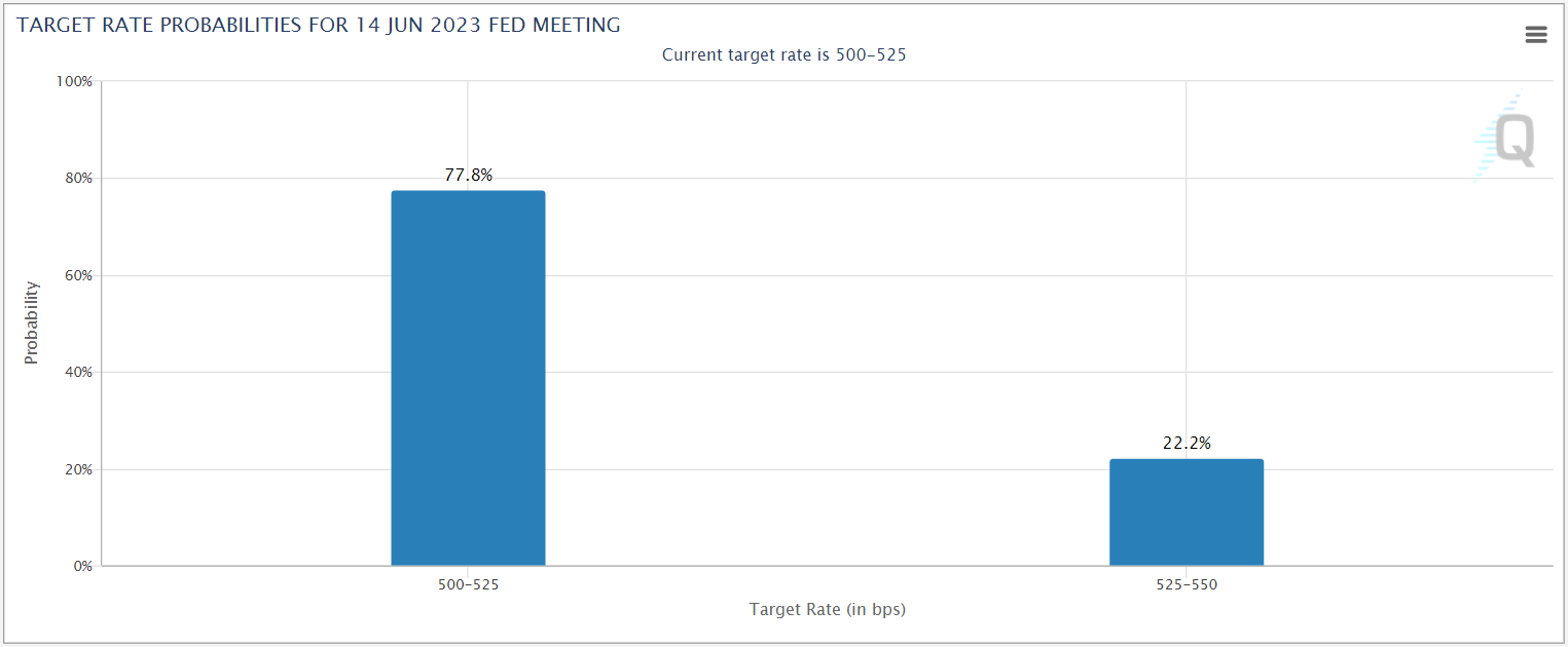 在鲍威尔发表评论后,市场显示美联储下个月加息的可能性降低了近一半,从上周晚些时候的近40%降至现在的接近20%: