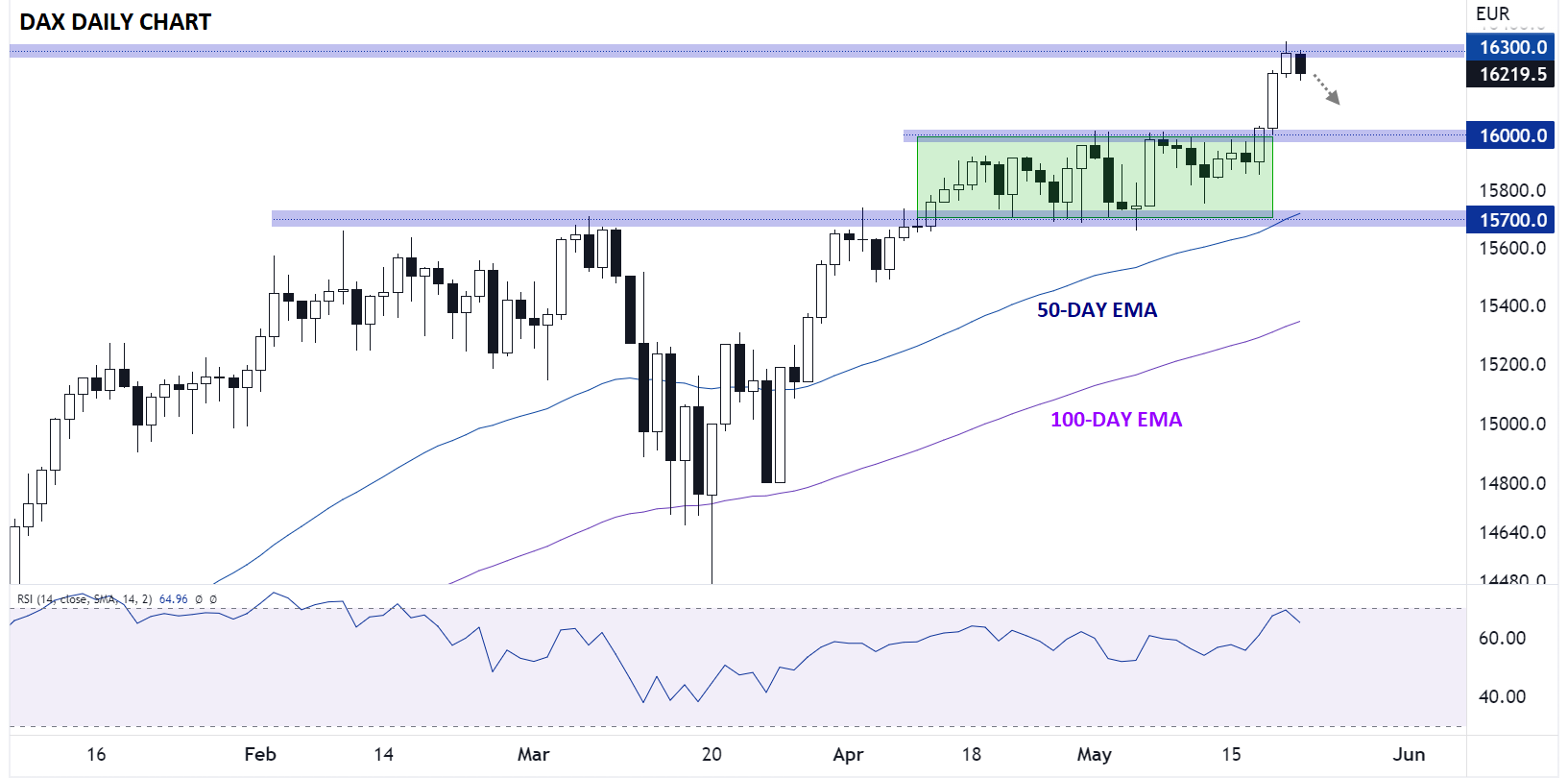 - DAX指数在上周大幅反弹至16,300以上并创下历史新高后,可能会喘口气。