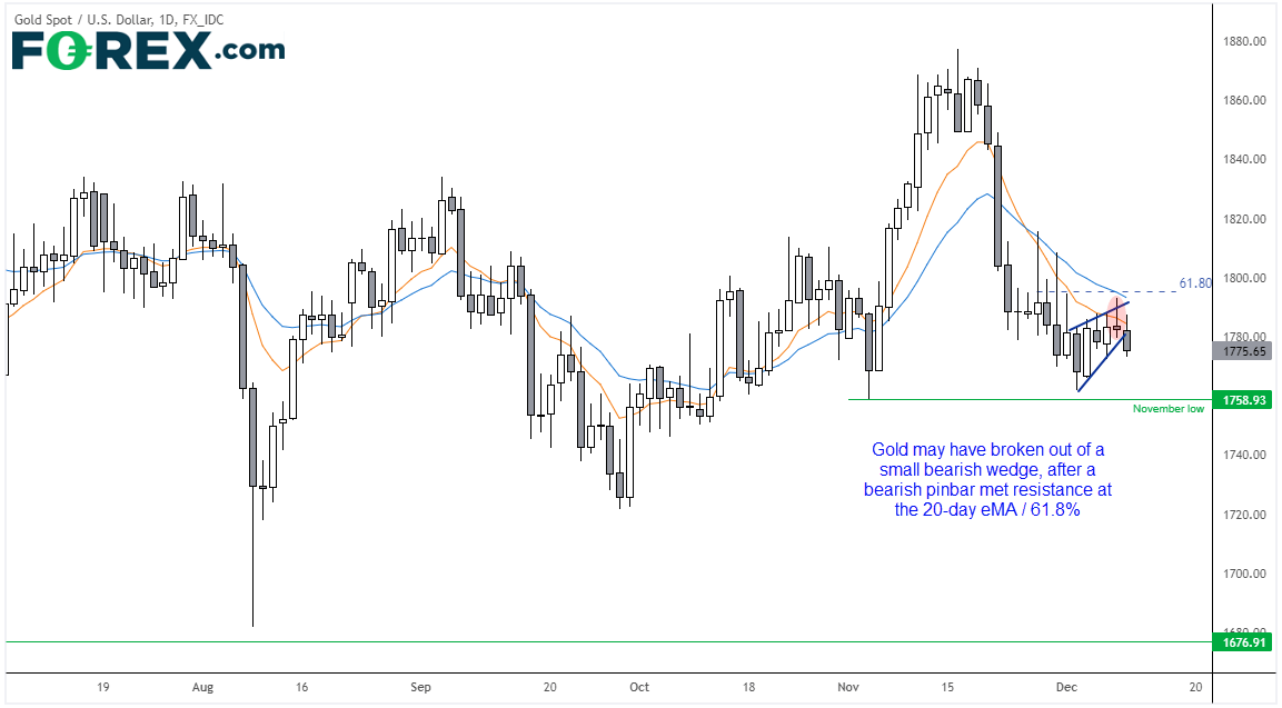 金价周三形成看跌pinbar,止步于20天指数移动均线和61.8%回档位,隔夜或已打破小型楔形。如果确实打破,预测目标在该形态的底部,即1762附近。而该形态是否成立则可能取决于今天的通胀报告。