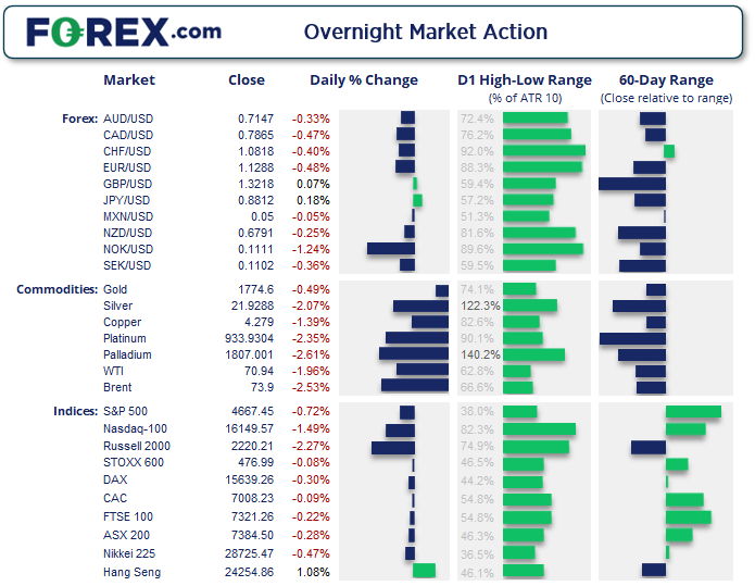 疫情管控措施给需求前景罩上阴影,油价同样下跌。西得州原油最高到达73上方不远处,止步于20天指数移动均线,随后下跌2.6%左右,最终形成看跌外包线。该K线本身是构成所谓黄昏之星反转形态的三根K线中的一根。加上RSI (2)同样处于超买区域,后市趋于延续昨天的回调势头。