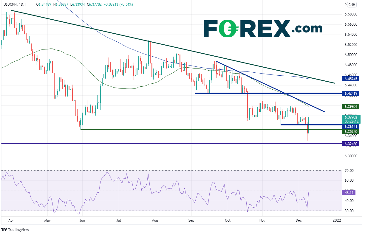 2021年三季度甫一拉开帷幕,美元/离岸人民币就走弱且此后日图持续、缓慢下跌,形成下降三角形(绿色趋势线)的盘整形态。美元/离岸人民币终于在周三下破该三角形的底部且跌至上述6.3304低点。周四上调RRR之举则推动美元/离岸人民币反弹并击穿水平阻力位。