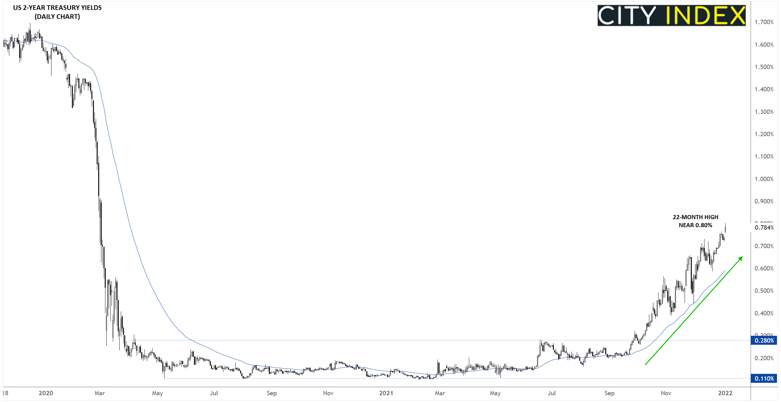 与以往一样,短期收益率和货币之间存在最为强烈的跨市场相关性。如下图所示,两年期美债收益率今天已上升5个基点,达22个月前疫情爆发以来最高水平: