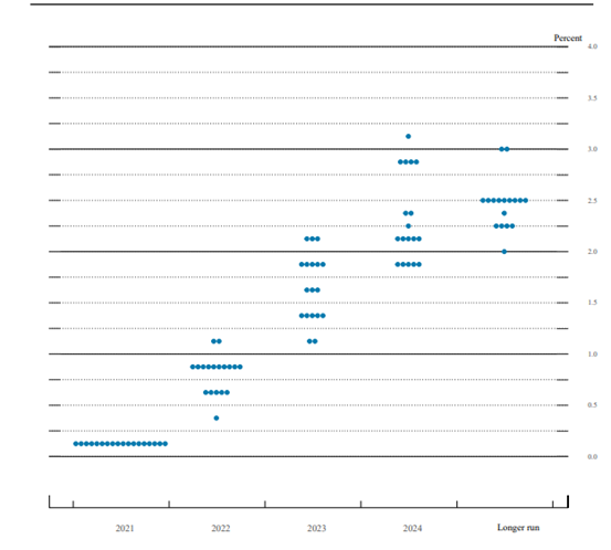 12FOMC会议的记录透露出比市场之前预期更加强硬的信息。从下图的点阵图(于12月中旬会议当晚发布)看,美国年内将加息三次,而且记录呈现的官员评论表明,对首次加息的中值预期值从20233月前移至20226月。这点与12月会议后发布的声明一致。FOMC评论也指出,“对较长期联邦基金利率的预期值一直没有上升”,而且“FOMC对所有基金利率的各项调查得出的结果大相径庭,所以,联邦基金利率前景不明”。