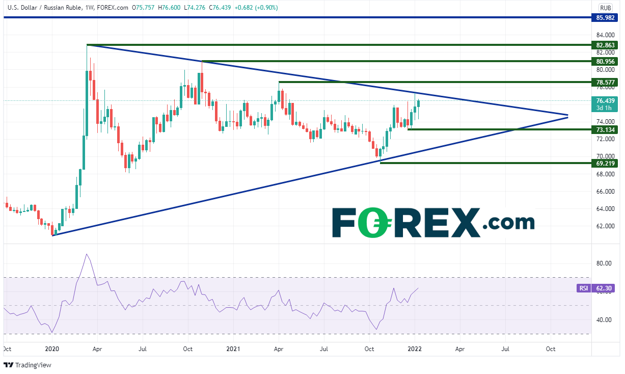 美元/俄罗斯卢布周图正尝试打破2020年1月开始成形的对称三有形。如果俄罗斯继续威胁北约,或北约及其盟国拒绝应承俄罗斯的需求,该货币对可能继续上涨。双方龃龉愈持久,美元/俄罗斯卢布的上涨空间可能越宽广。阻力位在上周高点与三角形下斜趋势线77.34附近,然后是水平阻力位78.58、80.96以及2020年3月高点82.96,最后一个水平阻力位在2016年高点85.98。但如果事态迅速平息,美元/俄罗斯卢布可能回撤。周图上的水平位在73.13和69.22。
