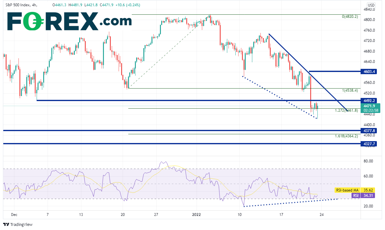 4小时图RSI同样与价格严重背离。价格如果确实反弹,上方会先后面临前低点4492.2附近和由下降趋势线与水平阻力位构成的阻力带,即4538附近。如果攻克,上档阻力在120日高点4603.4。但若价格继续下跌,则日图上的第一个支撑在4377,如果失守,下看20211220日低点到历史高点行情的161.8%扩展位,即4364.2附近。再接着是水平支撑位4327.74272.2