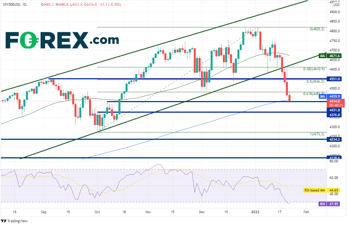 在以上种种不利因素综合作用下,标普500指数出现疫情爆发以来最大日内跌幅。但该股指的大幅下跌行情肇始于数周前,即在14日创下历史新高之后。标普500指数击穿了2021101日低点到202214日高点行情的61.8%回档位,即4481.5附近,攻克了200天均线4439.9,目前报在水平支撑位4431.8附近,相较那些历史高点下跌8%。对这些价位的迅速击破会带来反弹空间吗?日图下个支撑在4377附近。请注意,RSI处于30下方的超卖区域,表明股指或准备反击。