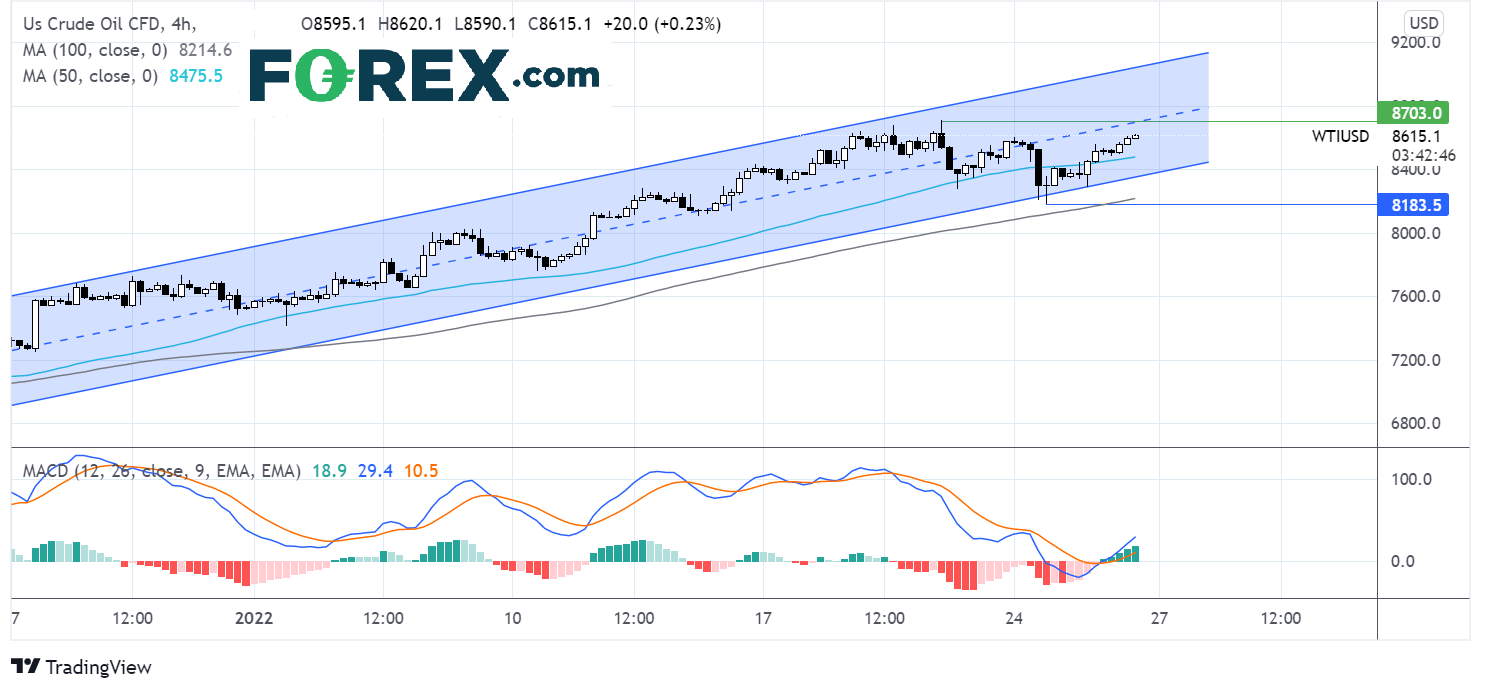 油价交投于12月20日以来的上升通道内,目前延续2周低点81.80以来的反弹势头,4小时图已收复50期简单移动均线。MACD支持价格扩大上行。