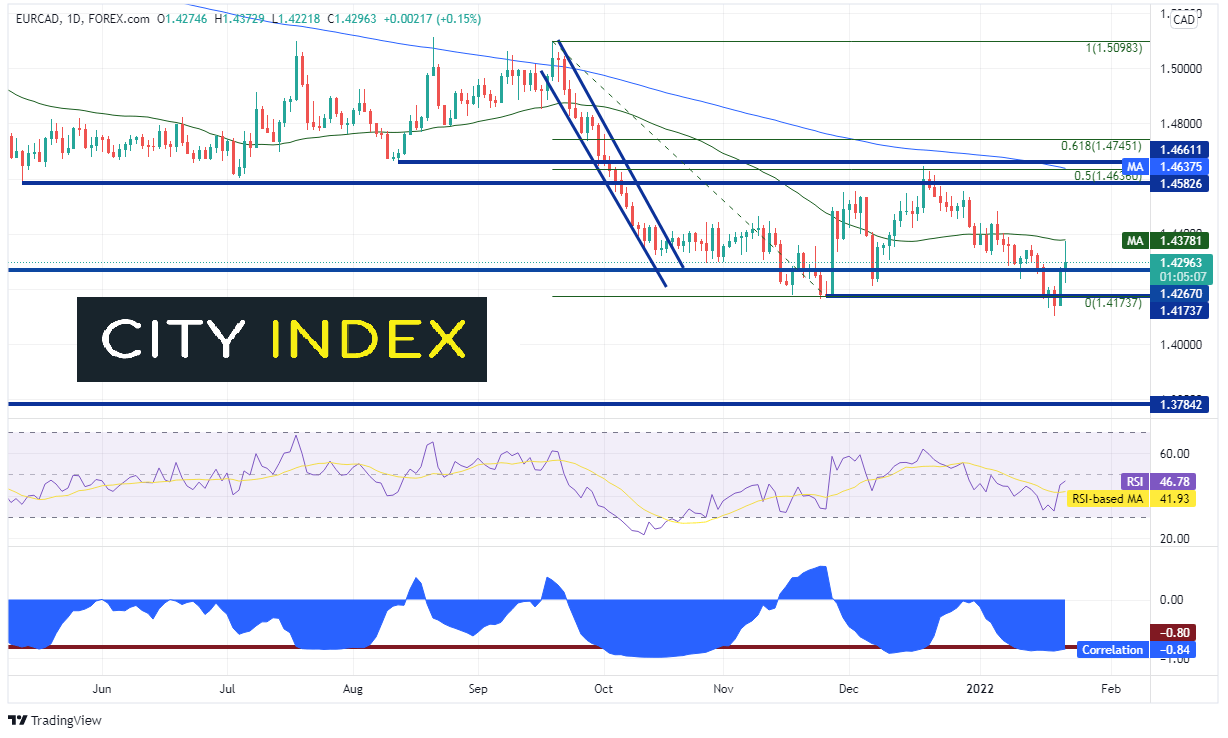 注意上方日线图底部,欧元/加元与原油之间存在很强的负相关 (类似美元/加元)。当前相关系数为-0.84。相关系数高于+0.80或低于-0.80则被视为两种资产之间具有强相关性。因此,交易者应该意识到,当原油朝某个方向移动,通常欧元/加元会朝相反的方向移动。