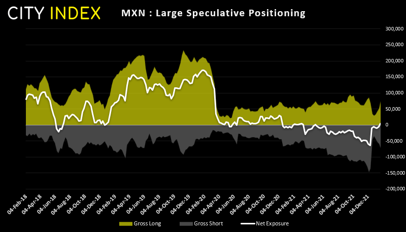 上周,大型投机商自2021年5月以来首次转而净做多墨西哥比索。过去的4周内,多头增持4.54万份多头合约,空头也增持了3.57万份空头合约。这种情况说明投资者很可能是在进行对冲,并非我们想要看到的强劲看涨信号。墨西哥比索也已连续7周走高,所以我们不禁好奇比索会不会结束连涨,多头会不会重新考虑敞口设置。