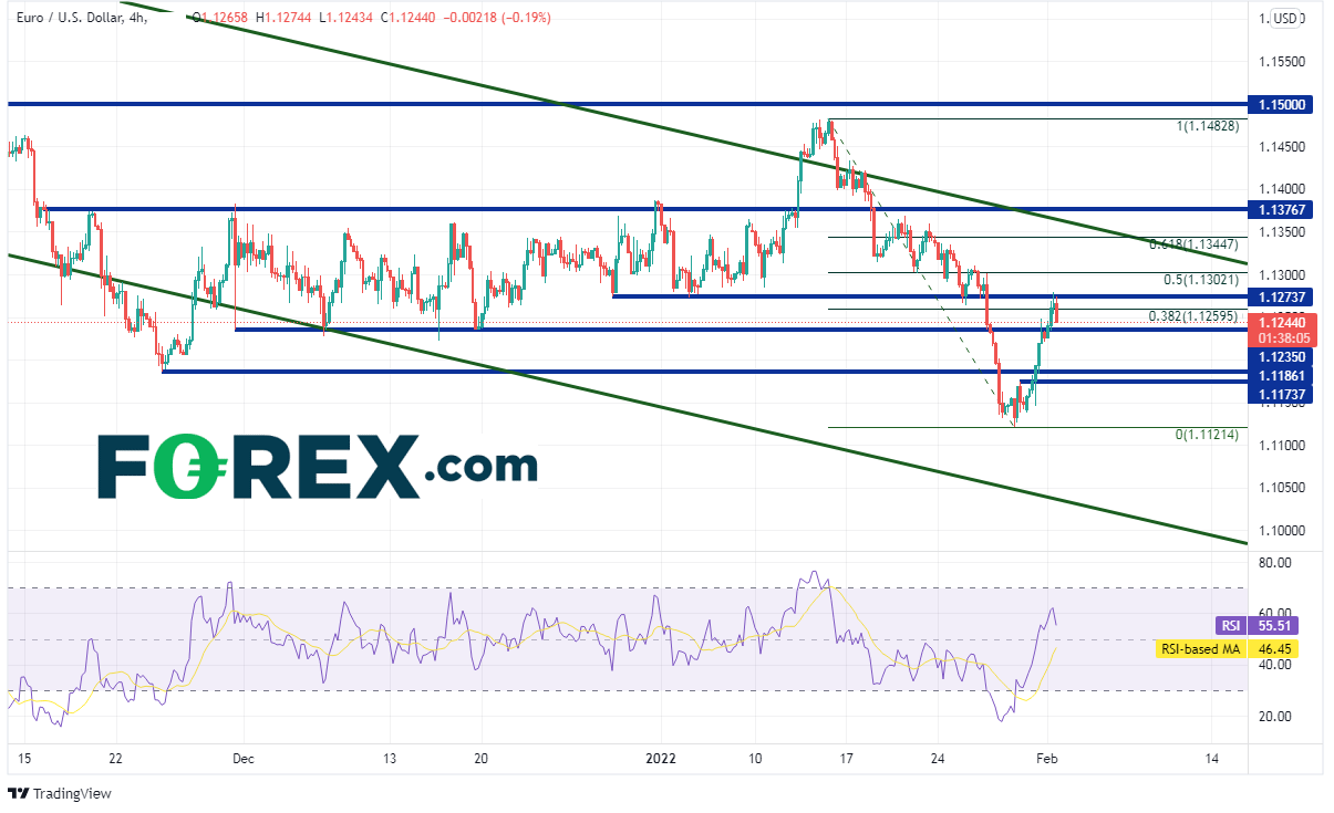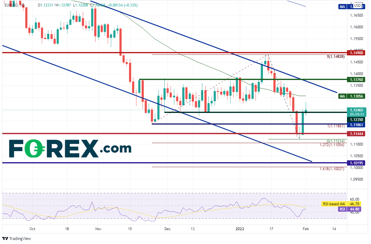欧元/美元从20215月以来一直处于下降通道中,一度于11月底下破此通道,之后横盘回到通道内,只在20221月中旬向上测试。202112月到20221月期间的横盘区间基本落在1.1235 - 1.1375(请看下图绿色线)。该货币对于127日下破前述通道与1124日低点1.1186,但于128日形成十字星、131日构筑长阳线,早晨之星形态成形,暗示后市向上反转。