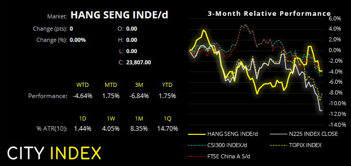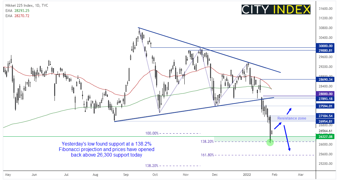 昨日下行于138.2%斐波拉契投射位附近获撑,现货市场此后跳空高开,开盘重回23327支撑位之上。股指有望迎来小型“同情式”反弹,攻向27000附近阻力。若此处作为阻力封顶,我们将转而看跌并在价格保持27184下方之时寻求适合策略。若升穿昨日高点,则发出更大幅反趋势走势警告,或上看27600。但若有证据显示阻力27000附近或下方高点降低,则暗示此轮同情式反弹已经没时间了。